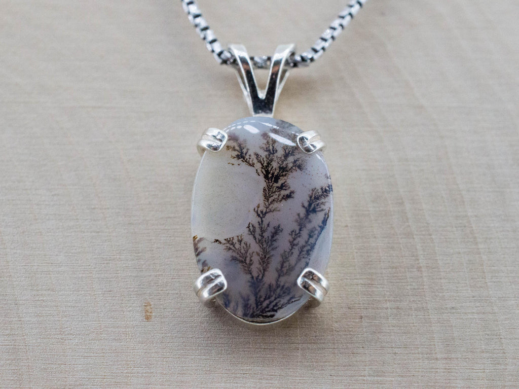 Dendritic Agate is a type of stone with "inclusions" of dendrites which are small fern like pieces of iron, manganese or other metal oxides that create interesting and very unique patterns in the stone.