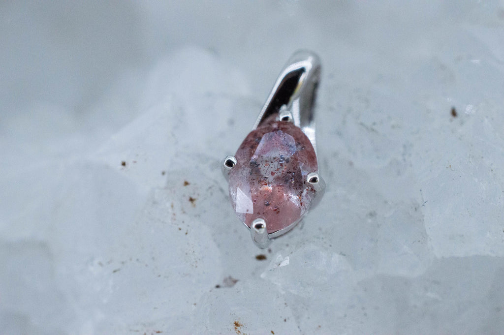 This awesome stone is colorless but has Red and Black specs of Hematite that naturally grew inside and may give off a small rainbow effect when the light hits it. It is a rare occurrence that makes these gems very unique!