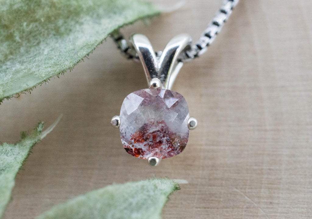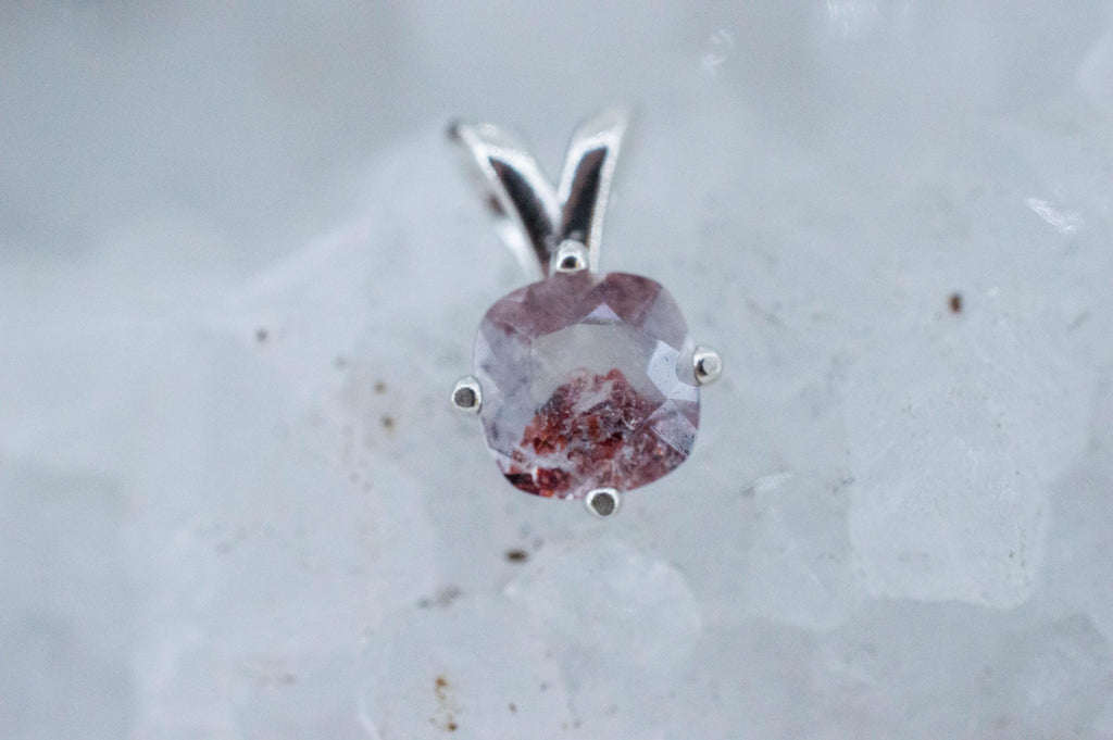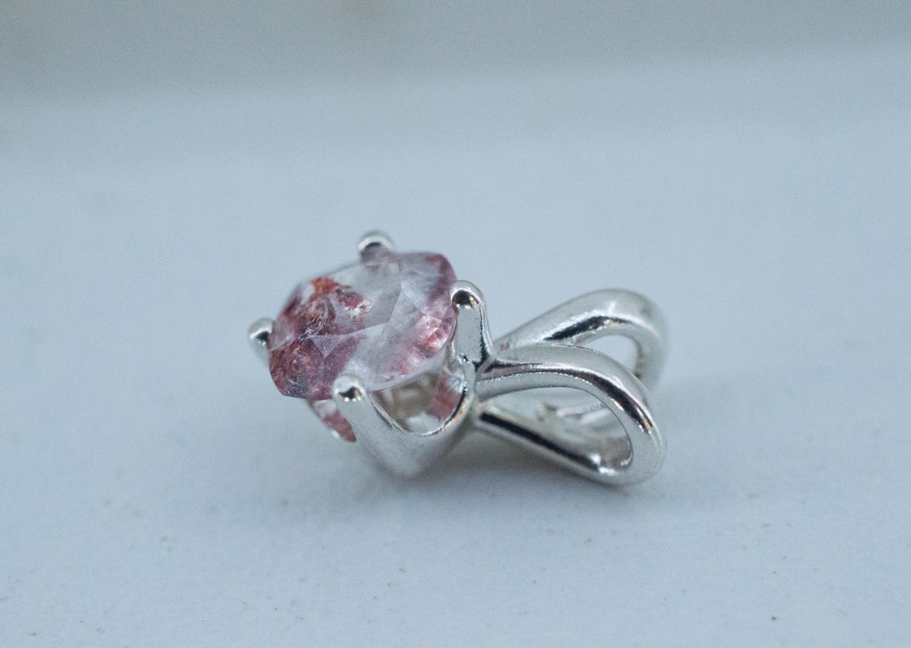 This awesome stone is colorless but has Red and Black specs of Hematite that naturally grew inside and may give off a small rainbow effect when the light hits it. It is a rare occurrence that makes these gems very unique!