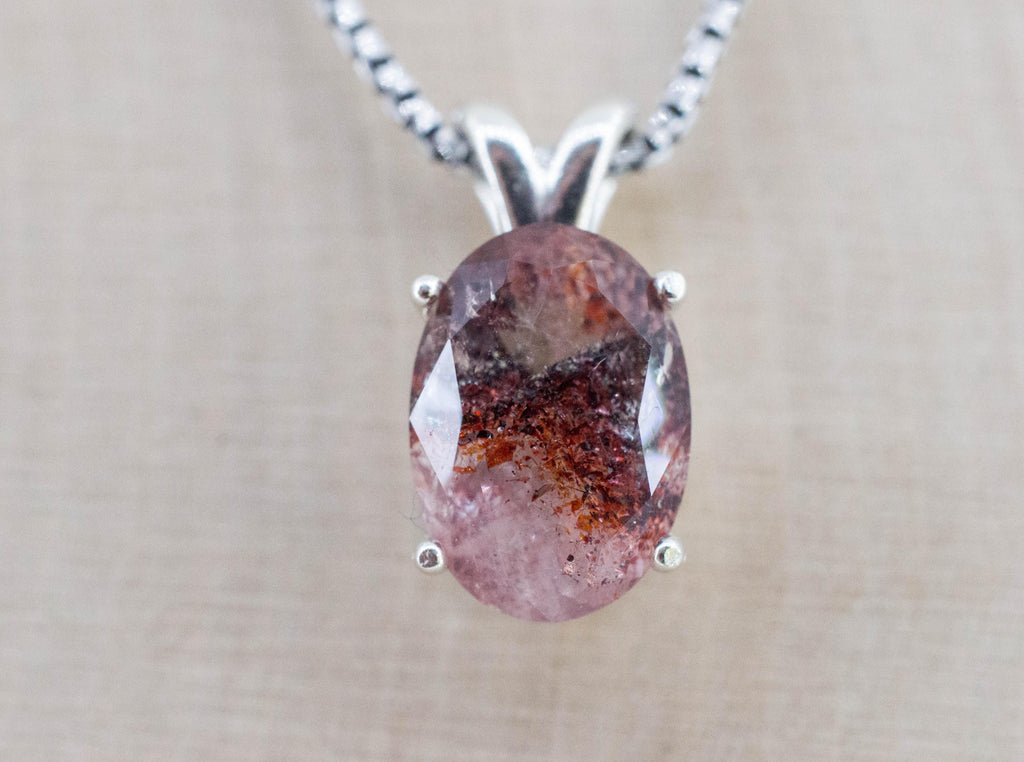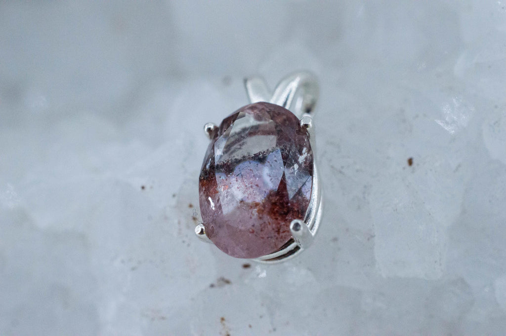 This awesome stone is colorless but has Red and Black specs of Hematite that naturally grew inside and may give off a small rainbow effect when the light hits it. It is a rare occurrence that makes these gems very unique!