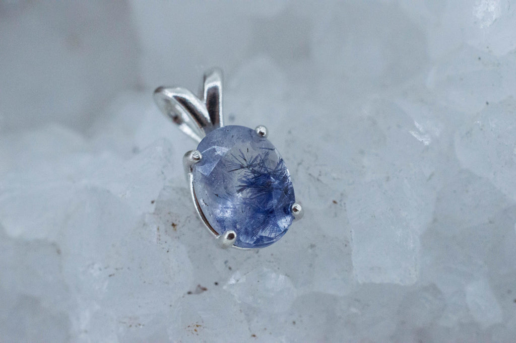 Dumortierite is a rare type of stone that is very rich in aluminum and has many industrial uses but looks great and is a hardy jewelry stone. In this piece, the Dumortierite formed inside the Quartz Crystal making unique patterns.