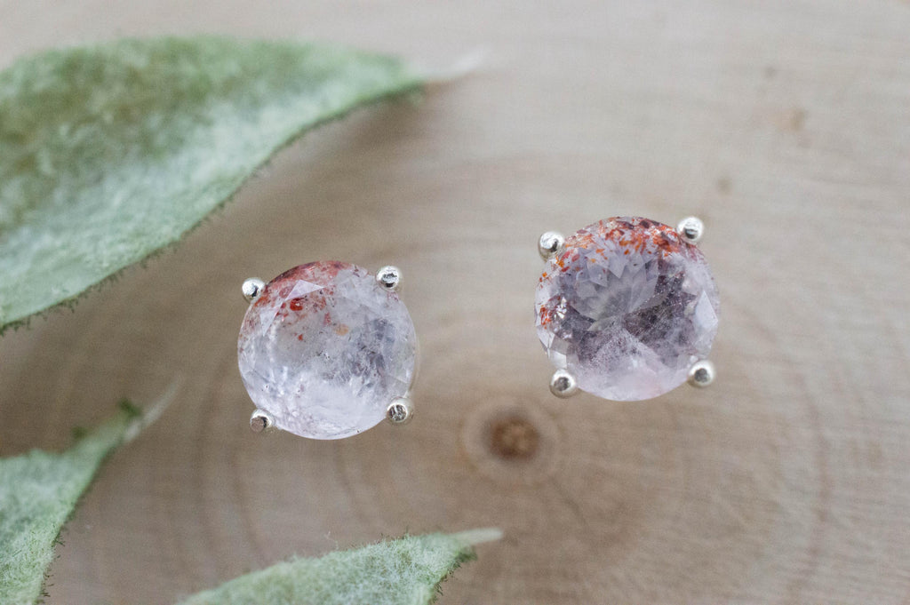 This awesome stone is colorless but has Red and Black specs of Hematite that naturally grew inside and may give off a small rainbow effect when the light hits it. It is a rare occurrence that makes these gems very unique!