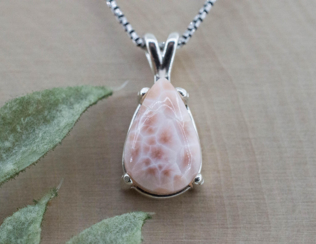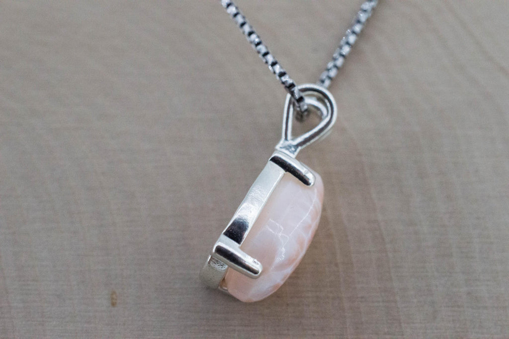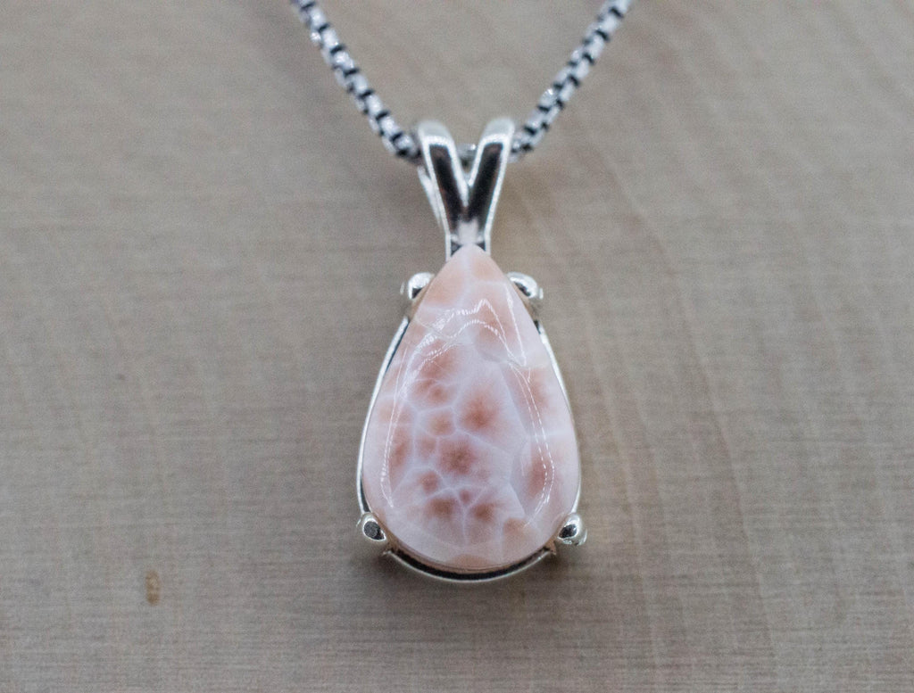 This Thomsonite also called Pink Larimar like all of them has interesting and unique patterns and great luster and will go great with most styles or occasions!
