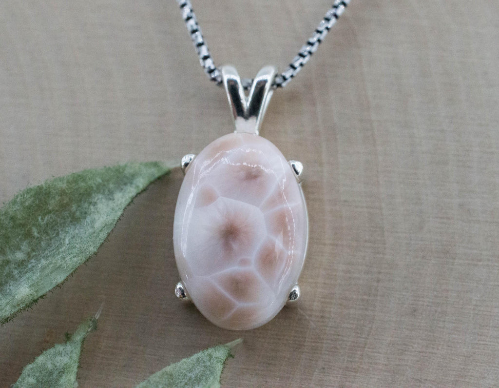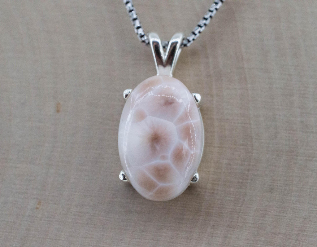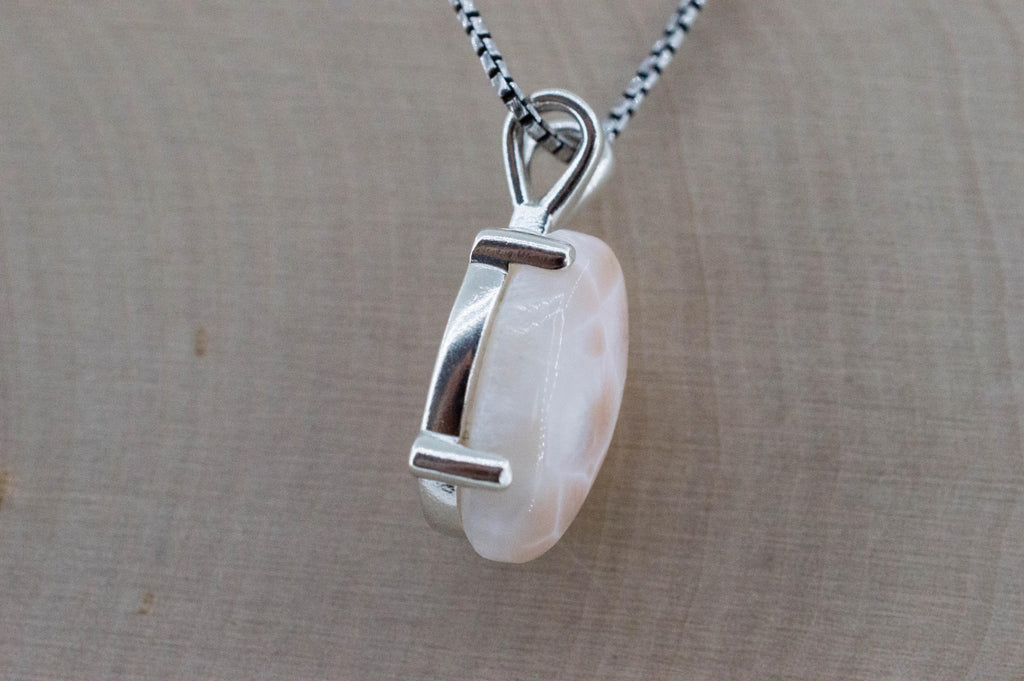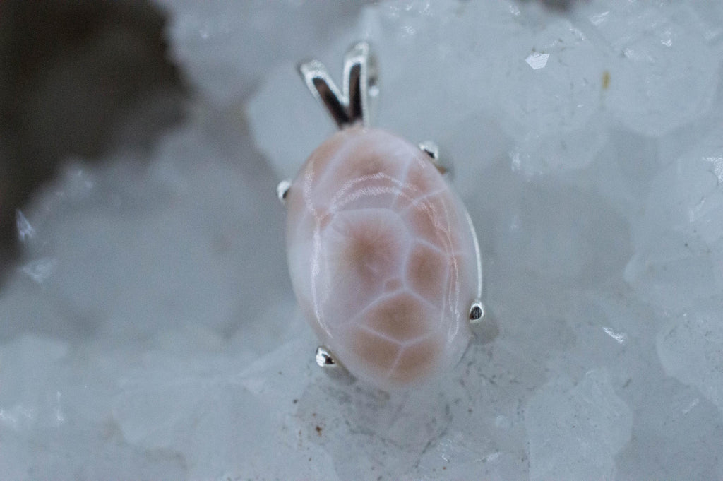 This Thomsonite also called Pink Larimar like all of them has interesting and unique patterns and great luster and will go great with most styles or occasions!